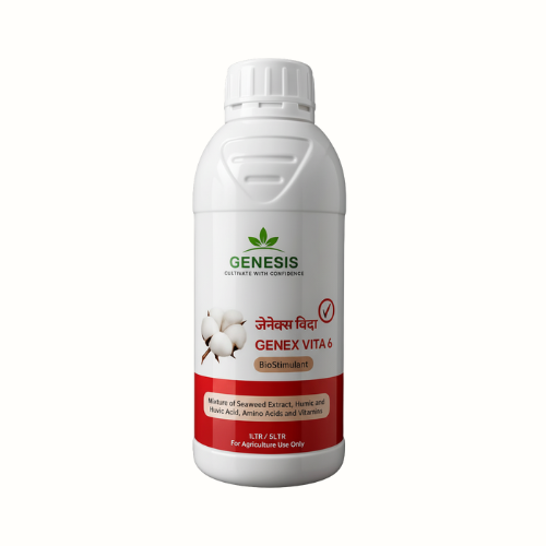जेनेक्स विटा 6 हे अल्जेनिक ॲसीड, ग्लायसिन, ह्युमिक व फुल्विक ॲसीड, जीवनसत्त्व C आणि ऑर्गेनिक कार्बनने समृद्ध नैसर्गिक माती व वनस्पती बायोस्टिम्युलंट आहे. हे मातीची सुपीकता वाढवते, पोषकतत्त्व शोषण सुधारते, मुळे व खोड मजबूत करून वनस्पतींची ताजेतवानेपणा वाढवते. तसेच दुष्काळ, उष्णता व पर्यावरणीय ताणांपासून संरक्षण देऊन उत्पादन, फळे, भाज्या आणि धान्याची गुणवत्ता व उत्पादनक्षमता सुधारते.